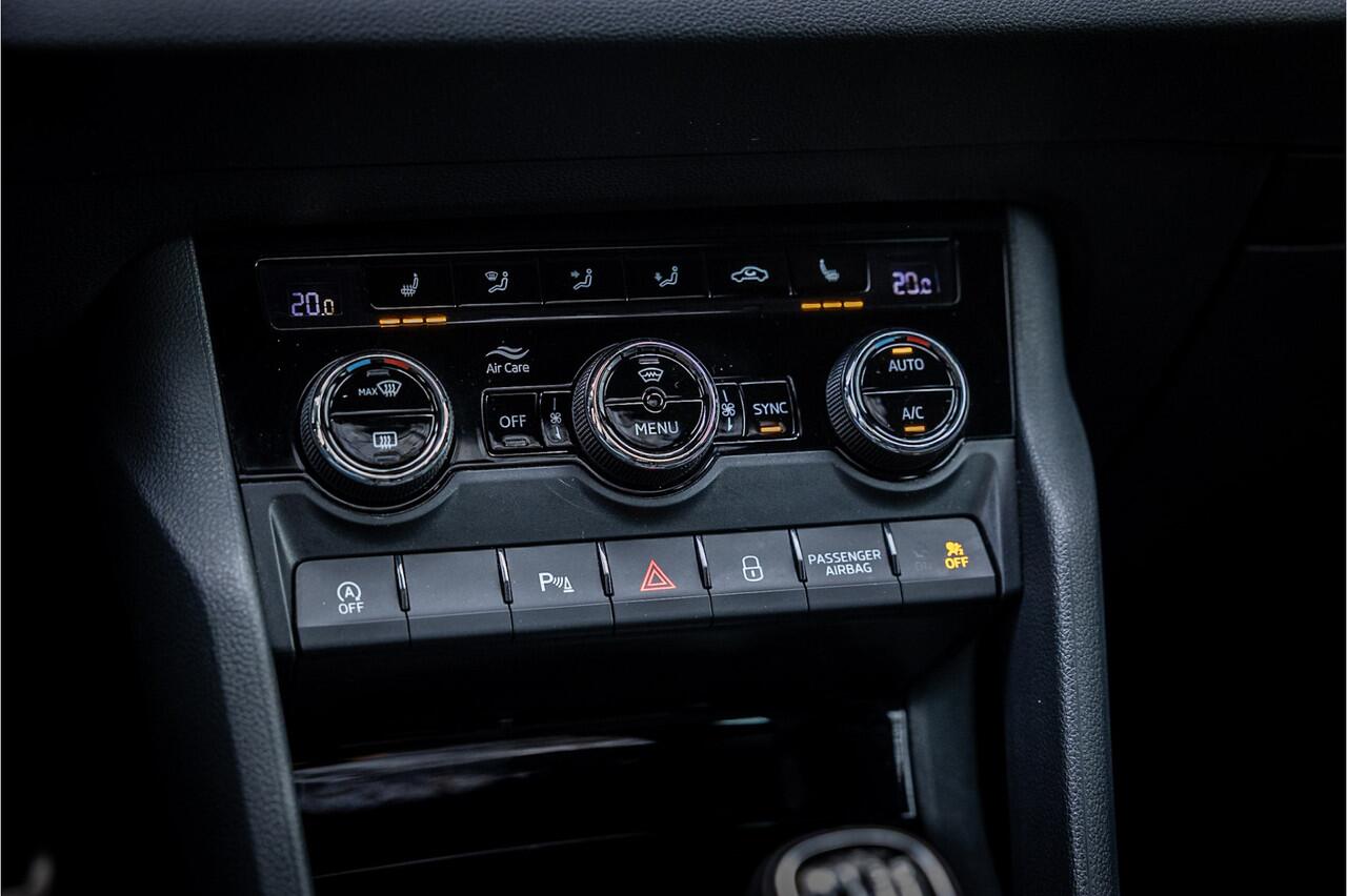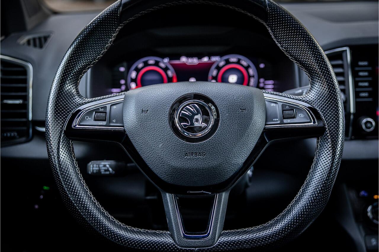 Fraaie Skoda Karoq in sportieve uitvoering en complete uitrusting. Lakkleur is Steel Grey en het interieur is voorzien van een combinatie van sportstoelen in antraciet Dynamic stof.